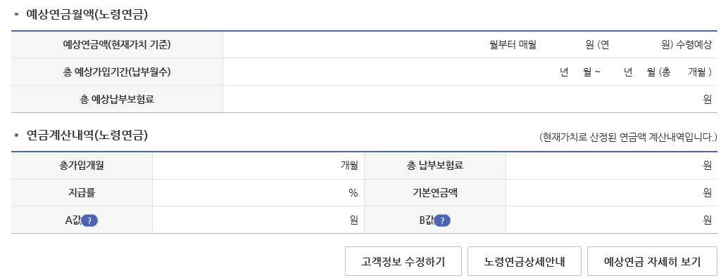 7. 마지막으로 내리시면 예상 연금월액(노령연금) 현재가치 기준으로 예상 연금액이 나오고 다음으로 연금 계산 내역을 확인할 수 있습니다.