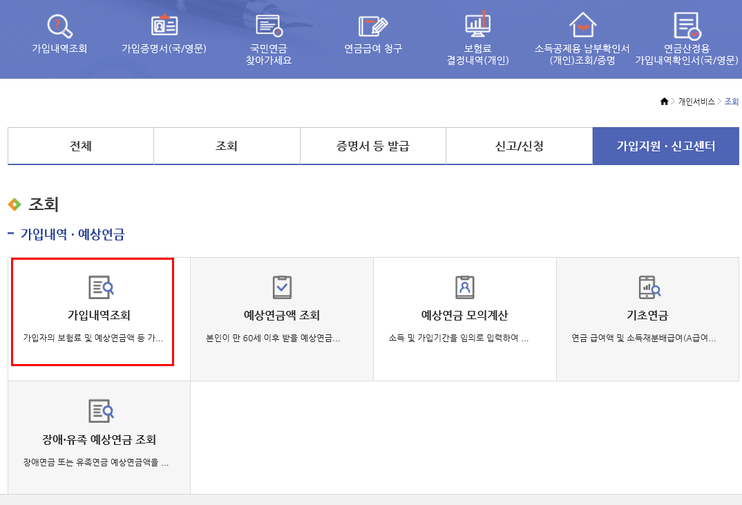 4. 조회를 눌러 들어가시면 가입내역조회, 예상연금액 조회, 기초연금, 예상연금 모의계산, 장애/유족 예상연금 조회 기능을 이용할 수 있으니 참고하시고 다음으로 가입내역 조회를 클릭해 주길 바랍니다.
